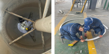 檢修現(xiàn)場(chǎng)更換稠厚器攪拌、硝一效主體墊子