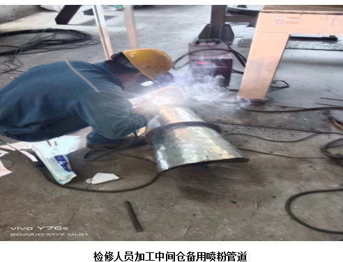 7月7日10:30分在生產(chǎn)丙班做好相關(guān)準備工作后,檢修班組員在中間倉開始在線技改,開孔加裝一根備用下料管道。在經(jīng)過七小時的辛苦工作后,備用下料管道順利完成。下料管道不僅可以備用,還可以在進口SO2過高時,啟動后增加下料量,提高脫硫效率,實現(xiàn)一舉兩得!