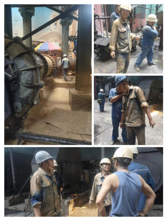 通過各負(fù)責(zé)人現(xiàn)場(chǎng)對(duì)故障情況分析,1#循環(huán)泵泄漏在可控范圍內(nèi)區(qū)域地坑可實(shí)現(xiàn)全收集。2#泵進(jìn)口閥門故障是備用循環(huán)泵長(zhǎng)期未使用導(dǎo)致閥門卡阻。生產(chǎn)部立即組織對(duì)2#循環(huán)泵閥門進(jìn)行搶修,檢修班長(zhǎng)帶頭,頂著漿液沖到事故點(diǎn)開始搶修。