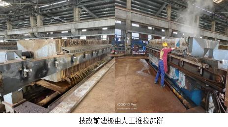 2022年3月威遠藍鼎正式接手成渝釩鈦科技欣興釩廠新區(qū)水處理整套水處理系統(tǒng)。運行至今,反應(yīng)釜壓濾機平臺在用的6臺壓濾機自動卸餅功能全部損壞,每臺壓濾機87塊濾板,平均每臺卸餅在1.5小時,每班人工依次卸餅一次,最高頻次兩次,人工勞動強度大,工作效率低。高產(chǎn)期間無法滿足濾水要求,同時因為環(huán)境和勞動強度致使員工離職率高。