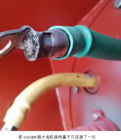 10月10日9:00西昌藍鼎一號燒結機槽滿停機,對應的一期脫硫脫硝系統(tǒng)也停機檢修,本次停機時間為16小時。電儀人員按照檢修計劃正常檢修,按照操作規(guī)程對一期增壓風機電機停電、驗電、接地開蓋檢查。在檢查過程中發(fā)現(xiàn)電機B相接線鼻子有變色現(xiàn)象,通過仔細觀察發(fā)現(xiàn)電機引出線鼻子電機修理廠家只壓接了一次;導致電纜線和線鼻子接觸不良,長期運行將造成接線端子發(fā)熱燒壞,極端情況下會燒壞6000KW的超大電機,造成巨大的經濟損失。