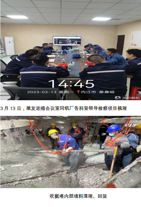 威遠(yuǎn)藍(lán)鼎提釩廢水處理和蒸發(fā)濃縮項(xiàng)目,自去年10月份停機(jī)大修至今已有近半年時(shí)間。運(yùn)行過程中水處理吹氨塔填料堵塞漏蒸汽,蒸發(fā)濃縮各單元設(shè)備故障明顯增加,影響系統(tǒng)運(yùn)行。威遠(yuǎn)藍(lán)鼎在釩廠回轉(zhuǎn)窯大修期間,提前消減廢水庫(kù)存至3000m3以下,避免廢水外送高爐。3月13日威遠(yuǎn)藍(lán)鼎副總經(jīng)理黃安軍、副部長(zhǎng)楊平、宋雨鵬在蒸發(fā)濃縮會(huì)議室組織釩廠各科室開展檢修協(xié)調(diào)會(huì),告知釩廠相關(guān)領(lǐng)導(dǎo)本次檢修項(xiàng)目的重點(diǎn)、難點(diǎn)、風(fēng)險(xiǎn)點(diǎn),為水處理爭(zhēng)取充足的檢修時(shí)間。