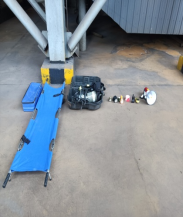 演練器材準備救援隊員穿戴救援器材受傷人員轉移至安全場所進行人工呼吸。