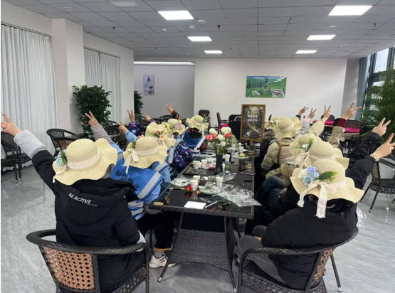 上午11時,創(chuàng)意手作環(huán)節(jié)在藍鼎茶坊開展,F(xiàn)場備有純色草帽及永生花、絲帶等裝飾材料,女員工們精心挑選花材,巧妙構思造型:有的將向日葵與康乃馨錯落點綴成環(huán)形花冠,有的用絲帶編織出立體蝴蝶結裝飾。大家邊制作邊交流配色心得,互相挑選合適的花朵、協(xié)助粘貼花材。“通過團隊協(xié)作完成作品,讓我們感受到了自己動手創(chuàng)造帶來的快樂。”一位參與者如是說。