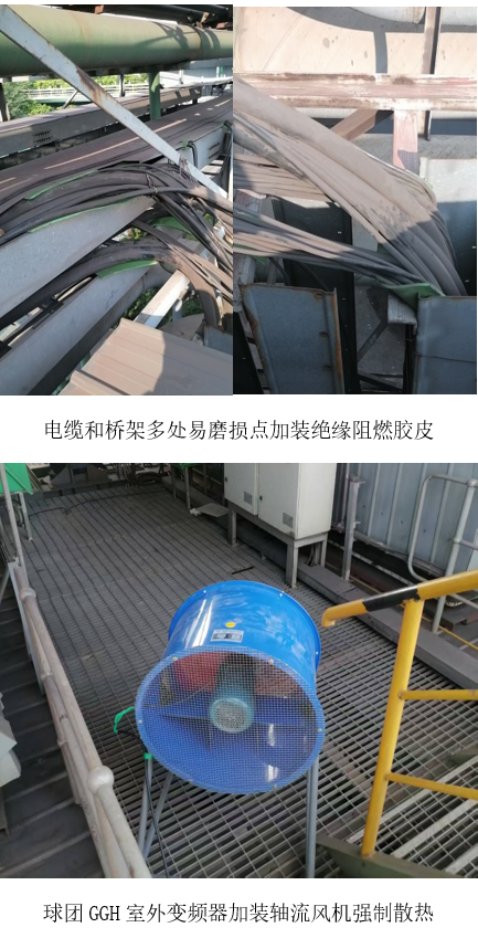 首輪排查聚焦公輔系統(tǒng)電纜橋架。電氣人員發(fā)現(xiàn)電纜與橋架金屬棱角存在外力磨損風(fēng)險(xiǎn),立即在多處易磨損點(diǎn)加裝絕緣阻燃膠皮,實(shí)現(xiàn)“以柔克剛”,杜絕短路及火災(zāi)隱患。隨后,針對(duì)球團(tuán)GGH室外變頻器柜散熱不良問題,技術(shù)人員加裝一臺(tái)大功率軸流風(fēng)機(jī),強(qiáng)制排熱,柜內(nèi)溫度由58 ℃降至43 ℃,保障變頻器長(zhǎng)周期穩(wěn)定運(yùn)行。