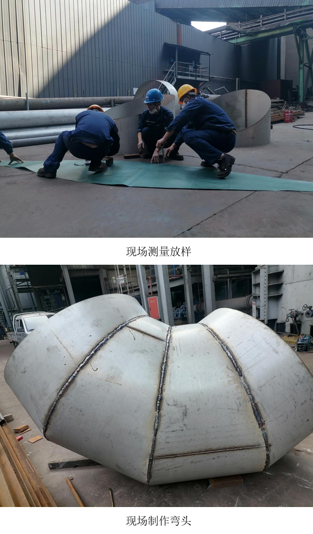 西昌藍(lán)鼎秉持“能自主絕不外委”的降本理念,為節(jié)約采購成本,僅采購了304不銹鋼短節(jié)直管材料,其余環(huán)節(jié)均由技術(shù)團(tuán)隊(duì)自主制作完成。從精準(zhǔn)測量彎頭角度、自主放樣下料,到彎頭制作成型、現(xiàn)場安裝調(diào)試,整個(gè)工藝流程實(shí)現(xiàn)100%自主化,既避免了成品彎頭及預(yù)制件的高額采購費(fèi)用,又鍛煉了隊(duì)伍在復(fù)雜工況下的實(shí)戰(zhàn)能力。